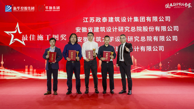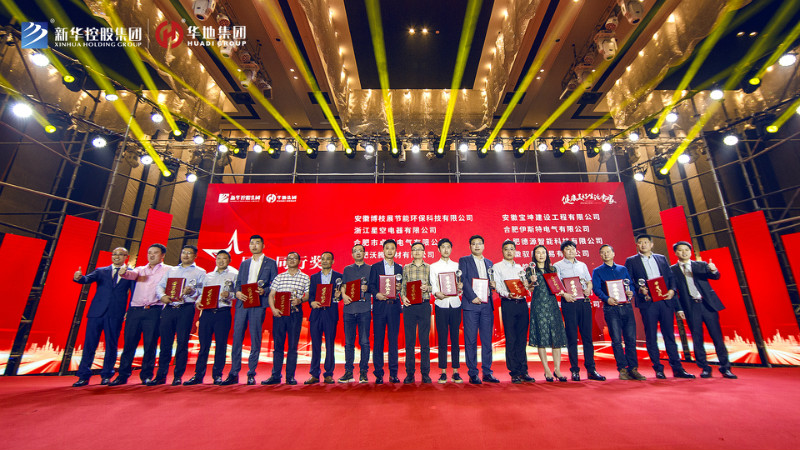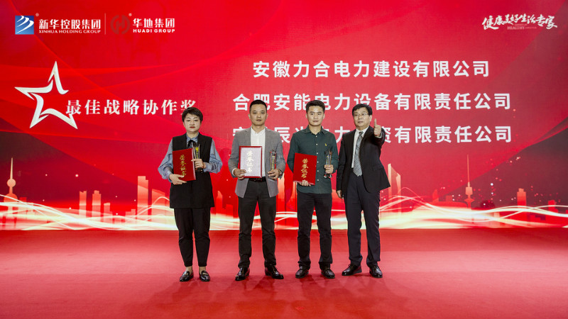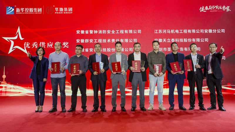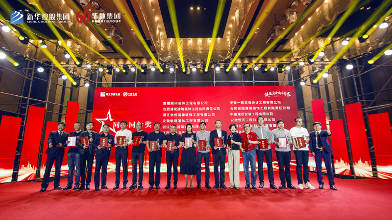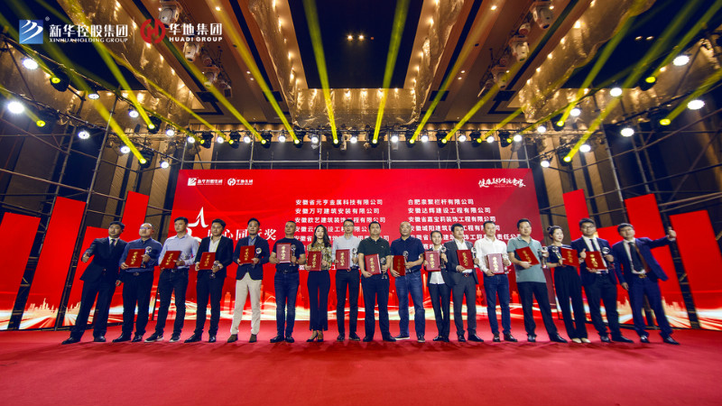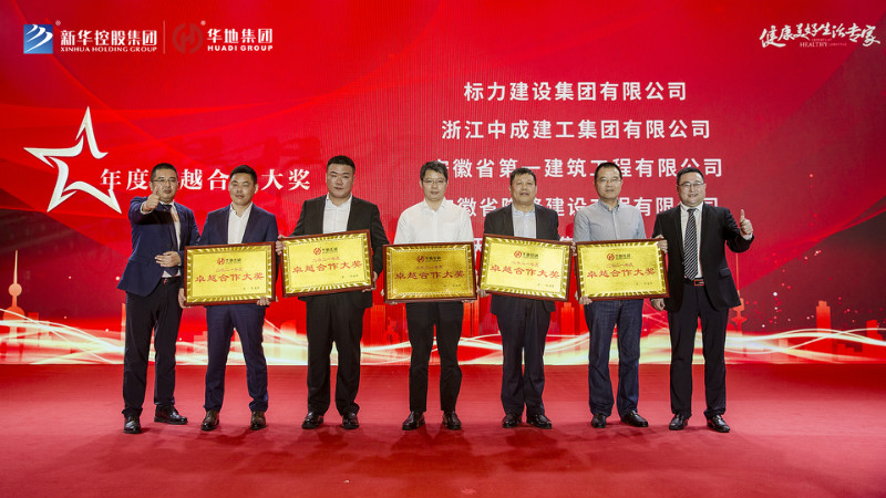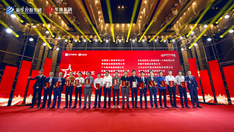 最后新華控股集團(tuán)副總裁兼華地集團(tuán)執(zhí)行總裁吳守狀先生、 新華控股集團(tuán)副總裁兼華地中安總經(jīng)理黃傳偉先生共同為標(biāo)力建設(shè)集團(tuán)有限公司、安徽省隆峰建設(shè)工程有限公司、浙江中成建工集團(tuán)有限公司、天元建設(shè)集團(tuán)有限公司、安徽省第一建筑工程有限公司頒發(fā)“年度卓越合作大獎”,將本次盛典氣氛推向高潮。