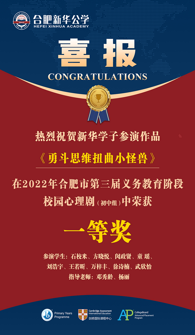 近日,“2022 年合肥市第三屆義務教育階段校園心理劇”評選活動圓滿結(jié)束,通過激烈的角逐,我校作品《勇斗思維扭曲小怪獸》榮獲初中組合肥市一等獎!