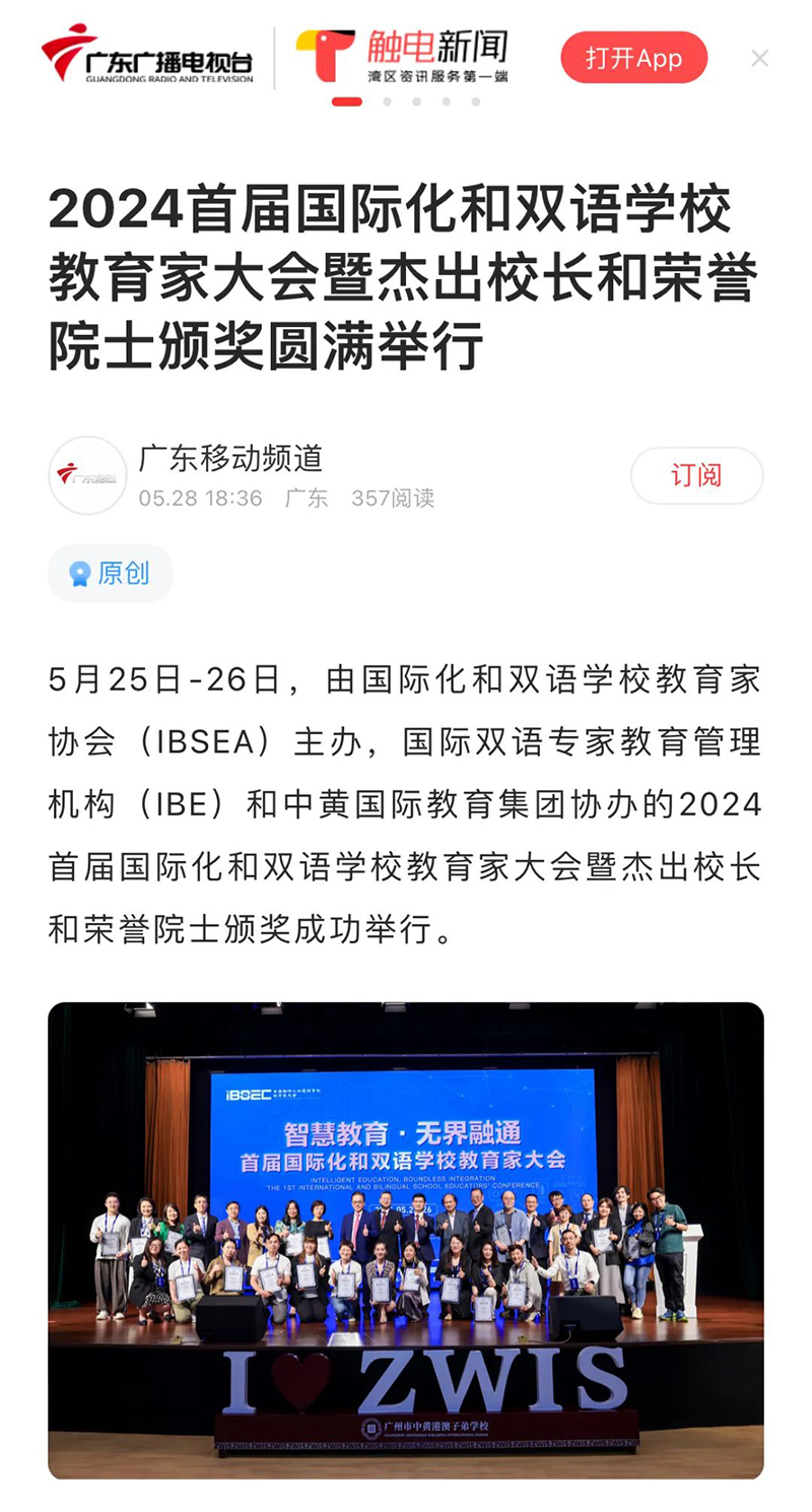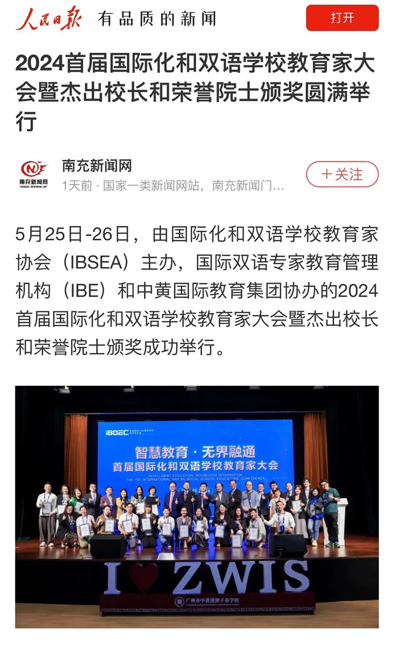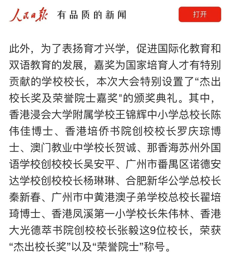 人民日?qǐng)?bào)、廣東電視臺(tái)等多家主流媒體對(duì)大會(huì)進(jìn)行了報(bào)道,重點(diǎn)聚焦在「首屆國際化和雙語學(xué)校教育家大會(huì)」為中國特色國際化教育從業(yè)者搭建了一個(gè)良性互動(dòng)的平臺(tái),為推動(dòng)AI人工智能技術(shù)與國際化教育融合所做的嘗試,以及為了嘉獎(jiǎng)有特別貢獻(xiàn)的學(xué)校校長而頒發(fā)的“杰出校長獎(jiǎng)及榮譽(yù)院士嘉獎(jiǎng)”。