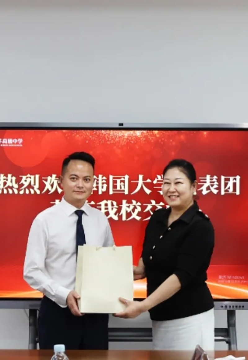 遠道而來的韓國交流團首先參觀了新華高級中學校園。參觀途中,吳東校長向韓國交流團介紹了學校的歷史、辦學理念以及校園文化等。學?,F(xiàn)代化的校園設施、優(yōu)良的教學環(huán)境、先進的教育理念,讓交流團贊不絕口。在現(xiàn)場交流會上,代表團與我?;ハ噘浰土硕Y物。