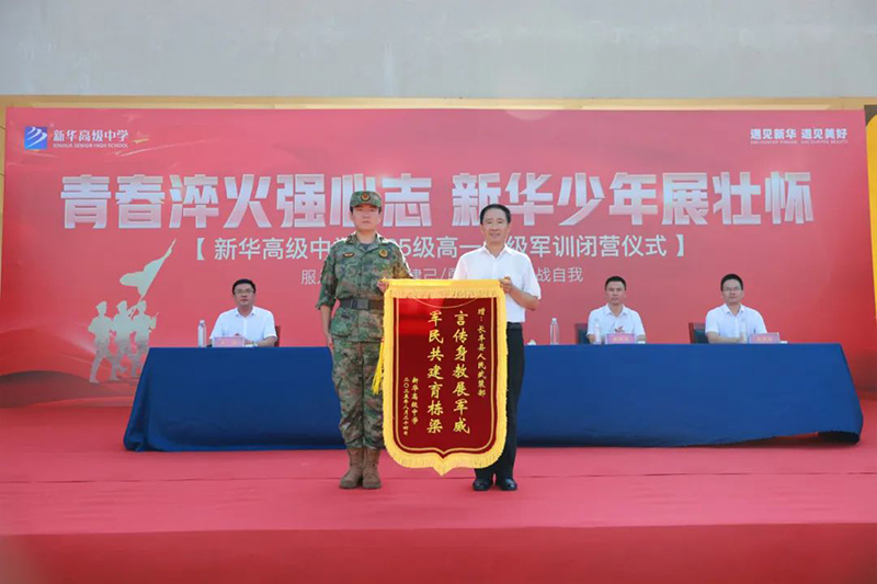 新華高級(jí)中學(xué)校長(zhǎng)徐邦民向長(zhǎng)豐縣人武部贈(zèng)送了錦旗,表達(dá)學(xué)校對(duì)全體教官辛勤帶訓(xùn)、嚴(yán)謹(jǐn)教導(dǎo)的衷心感謝。