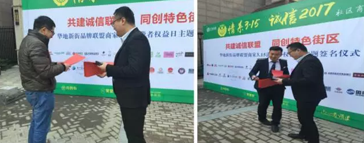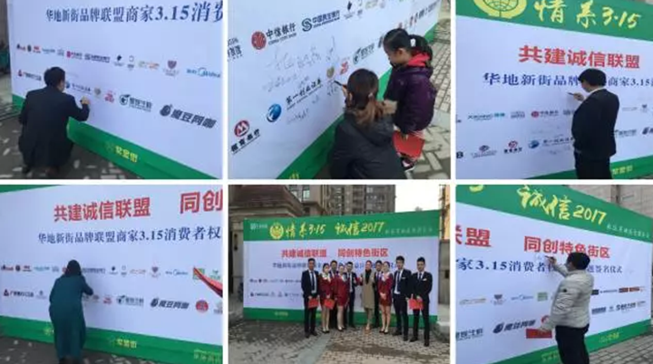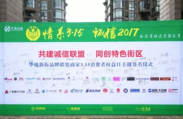 2017年3月15日,“華地新街品牌聯(lián)盟商家3·15消費(fèi)者權(quán)益日”主題簽名儀式在華地新街隆重舉行。上午10時(shí),各商戶代表齊聚在品牌墻下,由商業(yè)公司工作人員向大家宣讀并發(fā)放《倡議書》,各商戶代表在品牌墻上鄭重簽名,為共建誠信聯(lián)盟,共創(chuàng)特色街區(qū)而簽下鄭重的承諾。