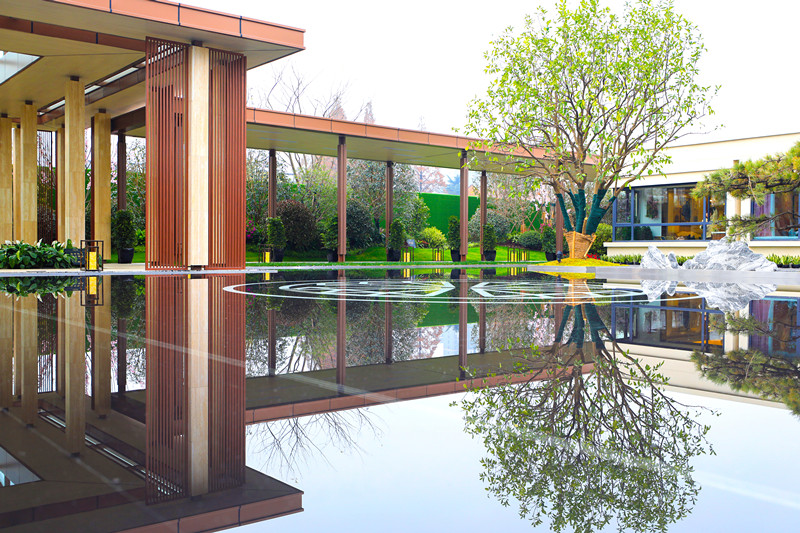 入戶處,緩緩流動(dòng)的水池如娟娟細(xì)流、栩栩如生的雕塑如麋鹿漫步、青蔥翠綠的灌木如山間野花,閉上眼,仿佛踏入了原始森林,神秘而寧?kù)o。