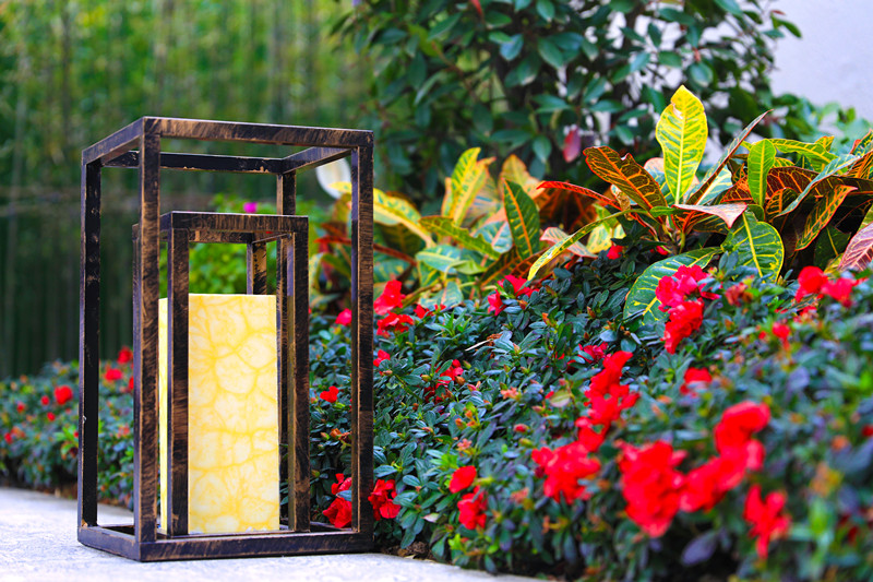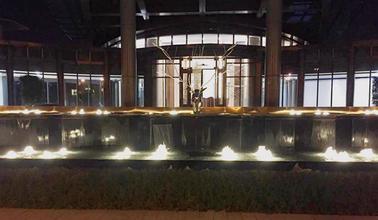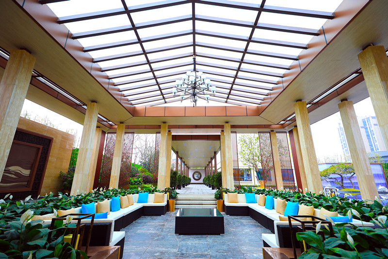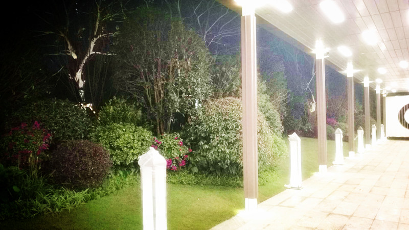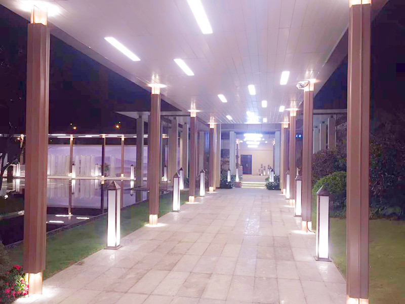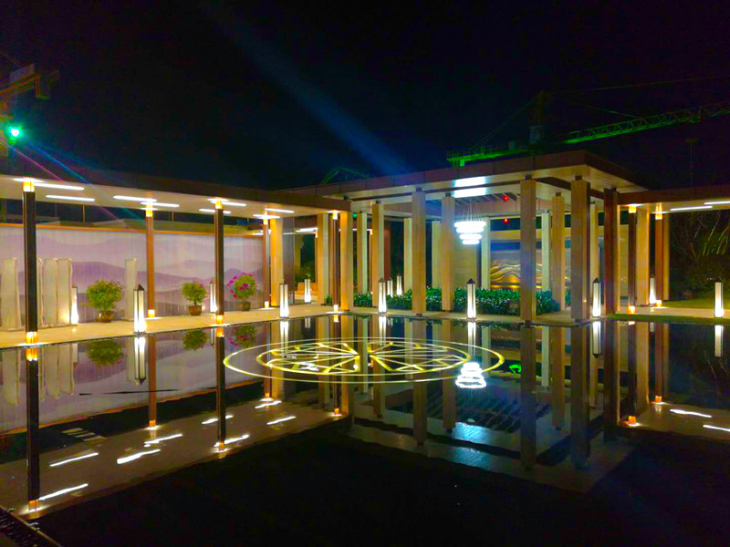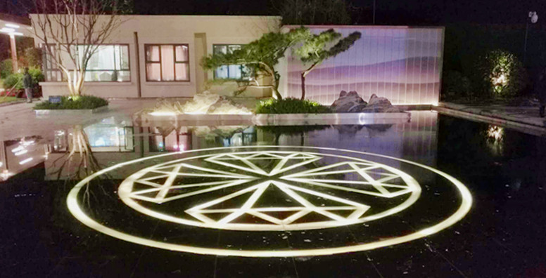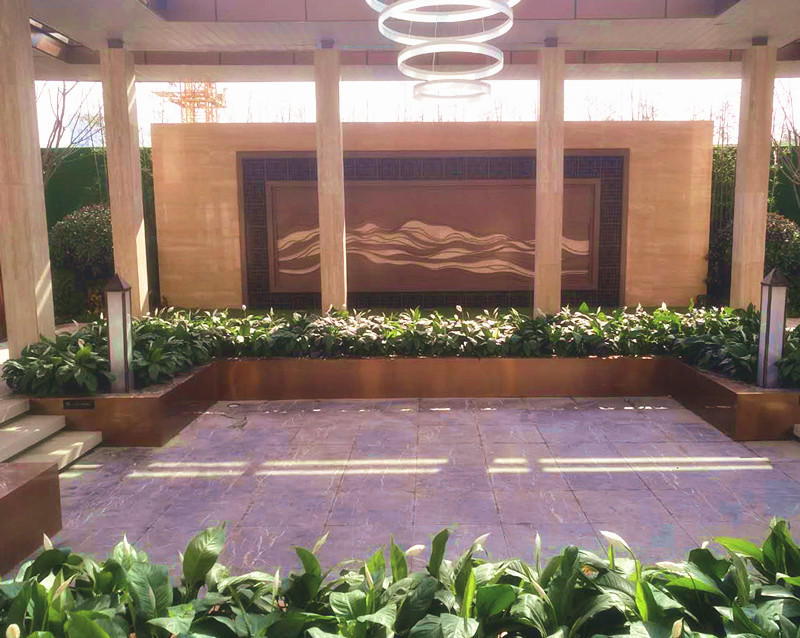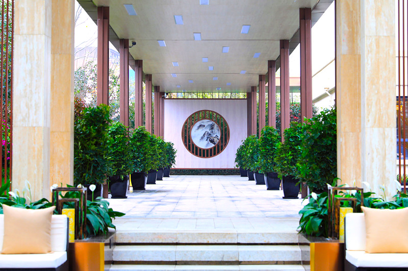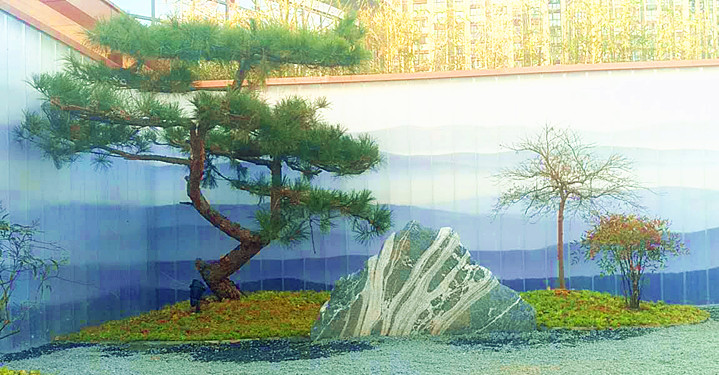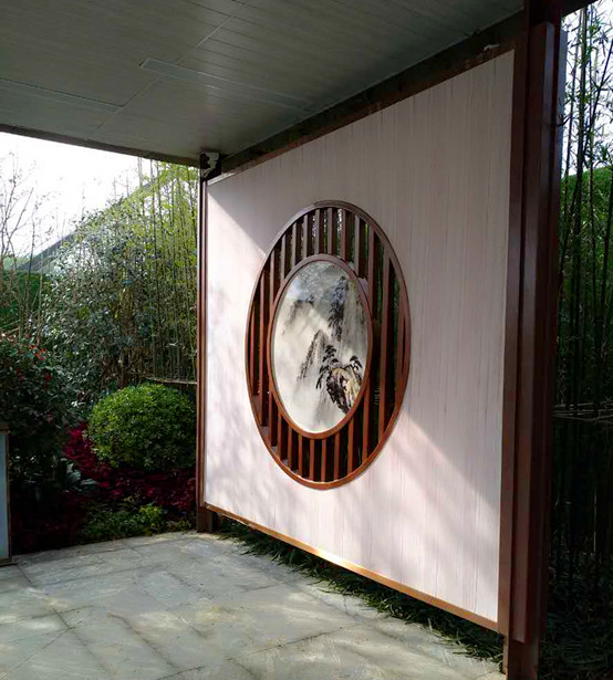 廊道的盡頭,一幅山水畫的屏風(fēng),與四周的苗木相映成趣,在燈光的映射下,更加的明亮清爽!