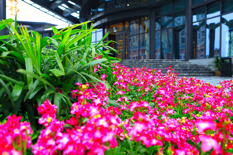 廊道旁,綠油油的草坪,花開(kāi)正艷的小苗木,修剪成型的灌木,以及筆直的喬木,構(gòu)成了一處處花境!