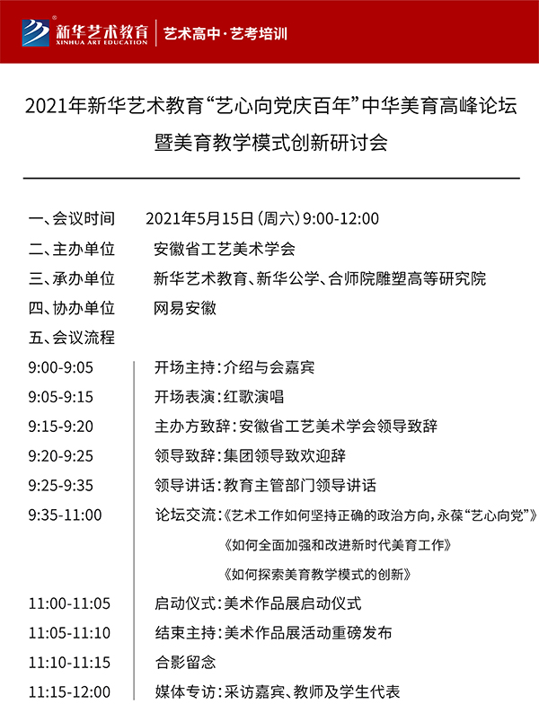 為貫徹落實黨和國家關于新時代美育工作的方針政策,積極探索美育教學創(chuàng)新模式,同時為謳歌中國共產黨百年輝煌歷程,抒發(fā)對黨的無限熱愛和忠誠,向中國共產黨建黨100周年獻禮,茲定于2021年5月15日舉行新華藝術教育“藝心向黨慶百年”中華美育高峰論壇暨美育教學模式創(chuàng)新研討會,并召開新華藝術教育“藝心向黨慶百年”全國中學生美術作品展啟動儀式。