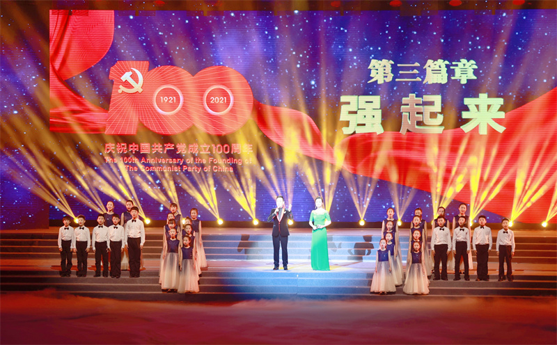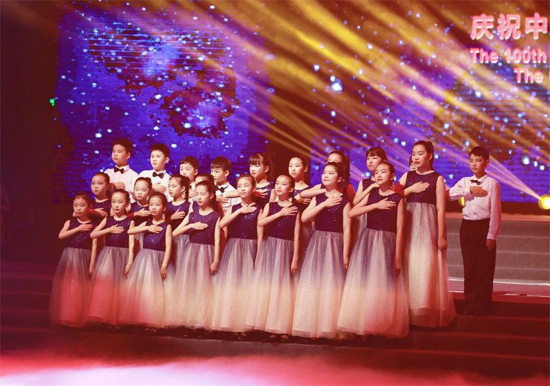 新華公學(xué)童聲合唱團(tuán)完美的用哼鳴式演唱法為晚會三個(gè)篇章開場,用歌聲向中國共產(chǎn)黨百年華誕獻(xiàn)禮,用微笑和行動(dòng)表明作為社會主義接班人的決心:“童心向黨,堅(jiān)決跟黨走,聽從黨的指揮”。