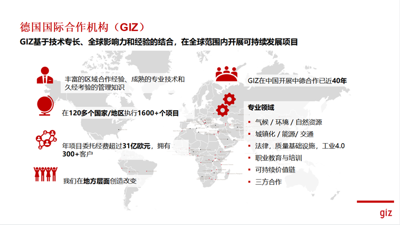 德國國際合作機(jī)構(gòu)(GIZ)是一個(gè)在全世界范圍內(nèi)致力可持續(xù)發(fā)展的國際合作非營利組織,擁有豐富的區(qū)域合作經(jīng)驗(yàn)、成熟的專業(yè)技術(shù)和久經(jīng)考驗(yàn)的管理知識(shí)。在120多個(gè)國家/地區(qū)執(zhí)行1600+個(gè)項(xiàng)目,業(yè)務(wù)范圍共包括氣候/環(huán)境/自然資源、城鎮(zhèn)化/能源/交通、法律、質(zhì)量基礎(chǔ)設(shè)施、工業(yè)4.0、職業(yè)教育與培訓(xùn)等。