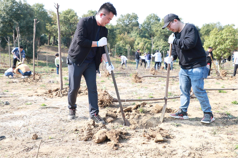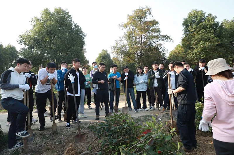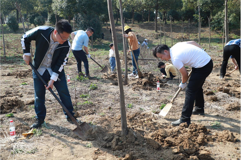植一株綠色,溢一片春光。格林生態(tài)總部員工一大早就集合在苗圃,他們希望通過此次植樹活動為苗圃增添“綠色新衣”。在專業(yè)人員的指導下,大家揮鍬鏟土、扶樹正苗、澆水培土,栽下一棵棵樹苗。三五人一組,分工合作、默契配合,男生挖坑、鏟土,女生扶苗,填埋,到處都是勤勞忙碌的身影。