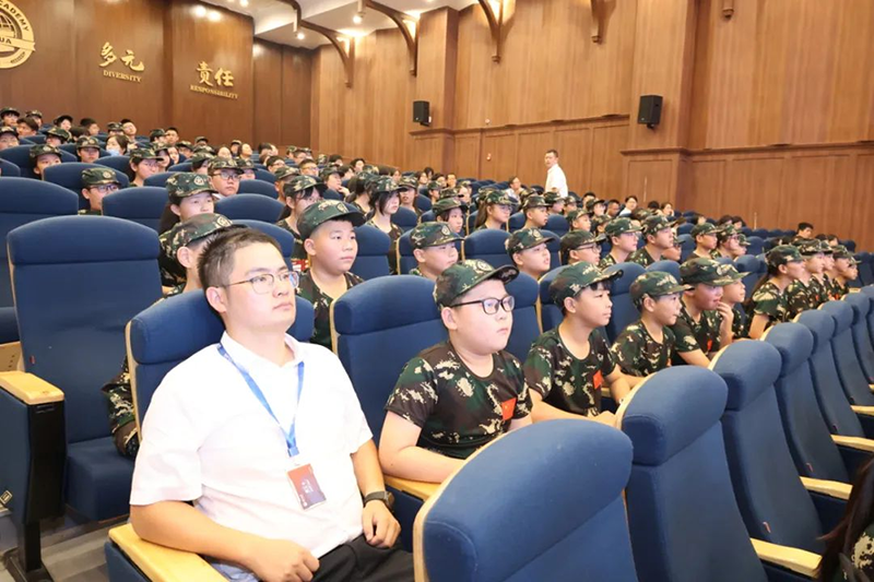 接著在同學(xué)們熱烈的掌聲中,教官們登臺(tái)亮相。萬(wàn)鑫智總教官代表全體教官發(fā)言,簡(jiǎn)明扼要地向孩子們傳達(dá)了軍人精神,并希望孩子們?cè)谲娪?xùn)期間能夠嚴(yán)守紀(jì)律,聽(tīng)從指揮。