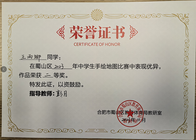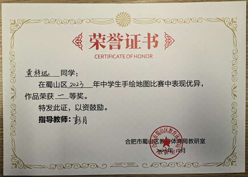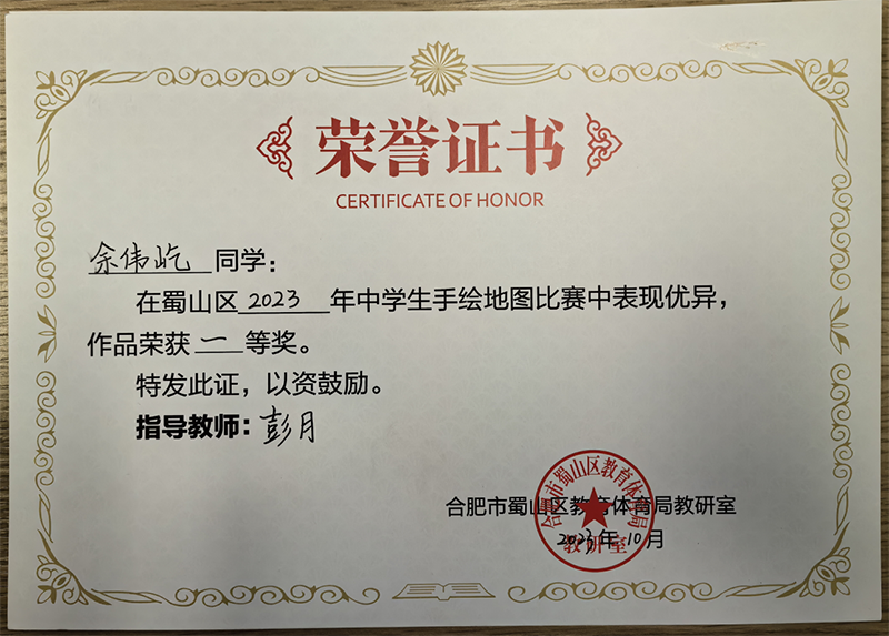 為了落實(shí)新課程標(biāo)準(zhǔn),提升學(xué)生地理學(xué)科素養(yǎng),增強(qiáng)學(xué)生的版圖意識(shí),在國(guó)慶之際,蜀山區(qū)舉辦了地理學(xué)科2023年蜀山去中學(xué)生手繪地圖比賽。新華公學(xué)積極響應(yīng),參加了本次比賽并取得了優(yōu)異成績(jī)。