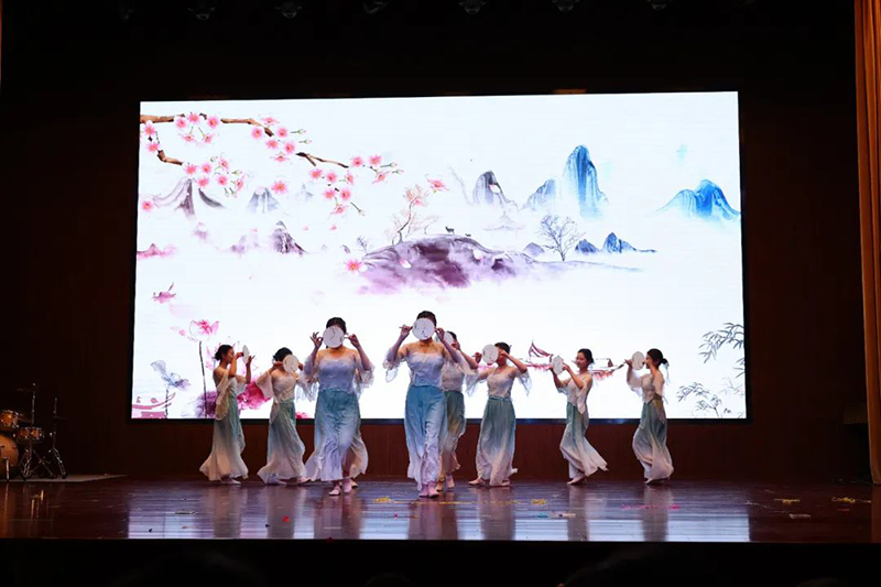 百變的幼兒園老師們,剛展現(xiàn)出女團(tuán)的熱烈,轉(zhuǎn)眼又變成嬌滴滴的江南小姑娘。一把團(tuán)扇,一襲水袖,舞一曲煙雨朦朧的江南水鄉(xiāng)。