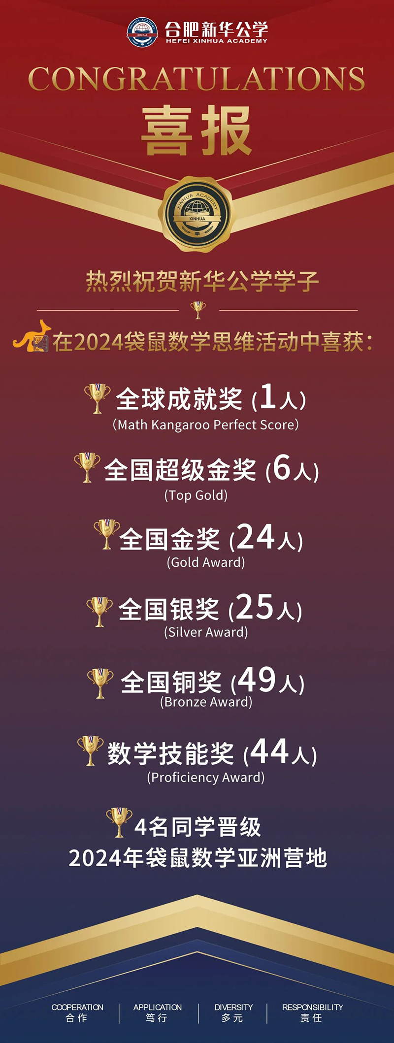 最后,再次祝賀所有獲獎同學(xué)與參賽同學(xué)!對數(shù)學(xué)的興趣只是起點(diǎn),而在自己感興趣的領(lǐng)域深入鉆研、甚至選擇了高出自身年級的難度等級來挑戰(zhàn)自己,這樣的自信力與勇氣更為可貴!我們希望參賽的每一位新華學(xué)子,都能因這樣亮眼的成績而獲得成就感,在以后的學(xué)習(xí)中充滿動力、再創(chuàng)佳績!