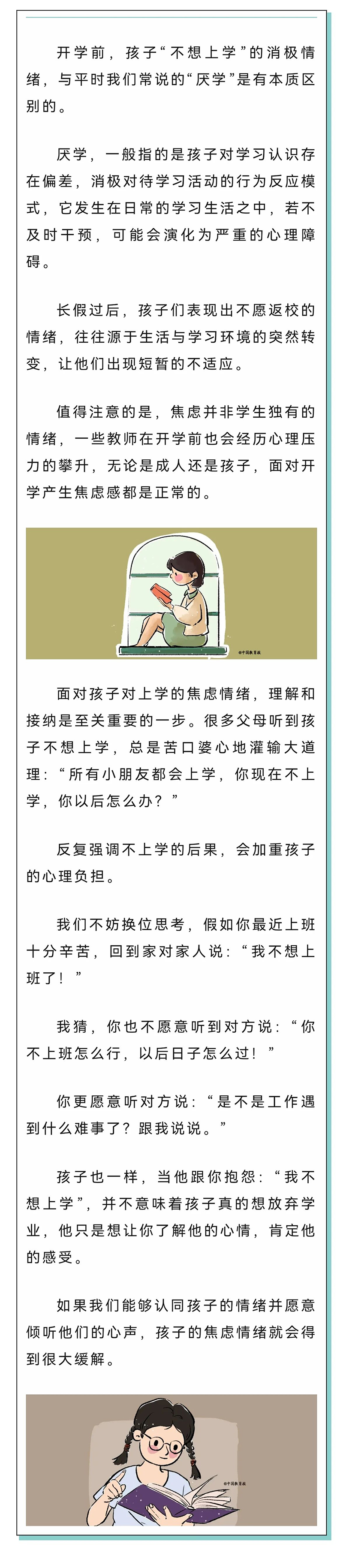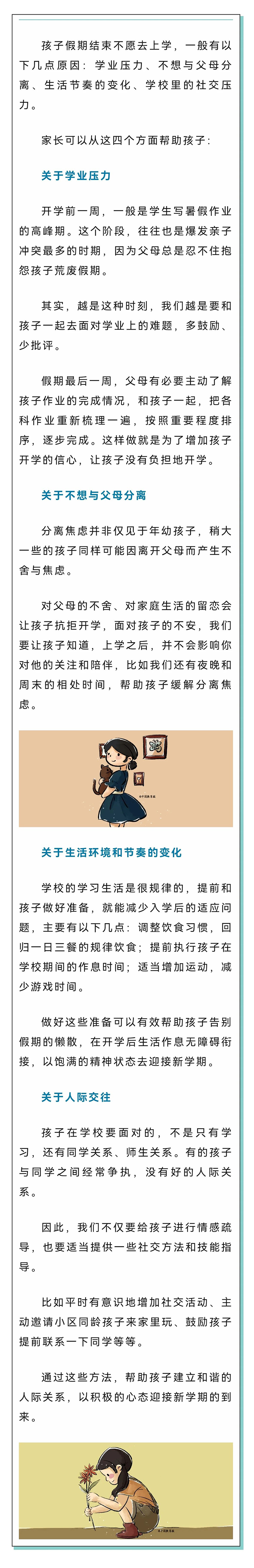 家長要嘗試去讀懂并理解孩子的情緒,幫助孩子分析原因,多鼓勵,多溝通。最重要的,是給予孩子積極的心理暗示。比如可以引導(dǎo)孩子回憶校園發(fā)生的趣事,喚醒孩子對老師同學(xué)、校園生活的想念,讓孩子重新燃起對學(xué)校生活的憧憬,從心理上對新學(xué)期充滿期待和信心。